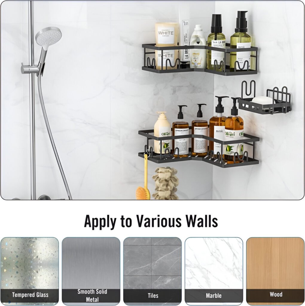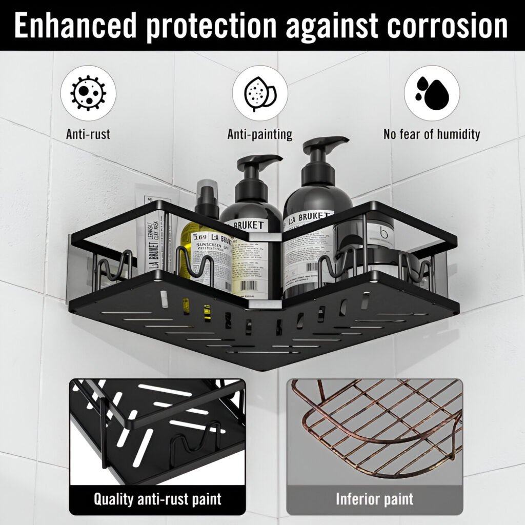 ⚡🛠️【Easy and Quick Installation】 This shower corner shelf can be installed on any SMOOTH surface (please ensure there is no tile joint or grout line beneath any adhesive sticker during installation). Just wait 24 hours before use ⏳. Easy to remove and re-install 🔄—no damage to your wall! 🚫🧱